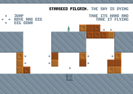 All tutorials in games are like the controls example above. A key point to consider in any analysis of teaching design in games is where the explicit tutorials end and from that point what critical information must the player learn through their own experimentation. In Starseed Pilgirm, the explicit instructions end shortly after the game begins. At the start of the game, some of the controls are explained. Shortly after that, a few more tips are presented by way of poetic lines, which could be a lot clearer: e.g. "Gain from loss/One does not measure/But broken hearts/Yield Starseed treasure." This line is designed to teach players that if they DIG into pink seed blocks, they'll gain a starseed. This message is not clear because of its poetic styling and because it's presented at a point in the game before players get a chance to use the PLANT mechanic. The player isn't told that spacebar PLANTS seeds before this point -- such critical instructions won't appear until the next world.